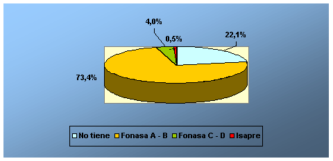 De acuerdo al cuadro anterior, se puede establecer que un 73,4% de los pescadores artesanales tiene acceso a la salud a través la modalidad de Fonasa de tipo A-B, y que un 68% utiliza los centros del Servicio Nacional de Salud. Esta situación obedece a que en un mayor porcentaje los pescadores se atienden bajo la categoría A que otorga Fonasa, es decir utilizando la tarjeta de gratuidad. Además, se establece que la cobertura de salud se canaliza a través de los centros de atención primaria de salud.